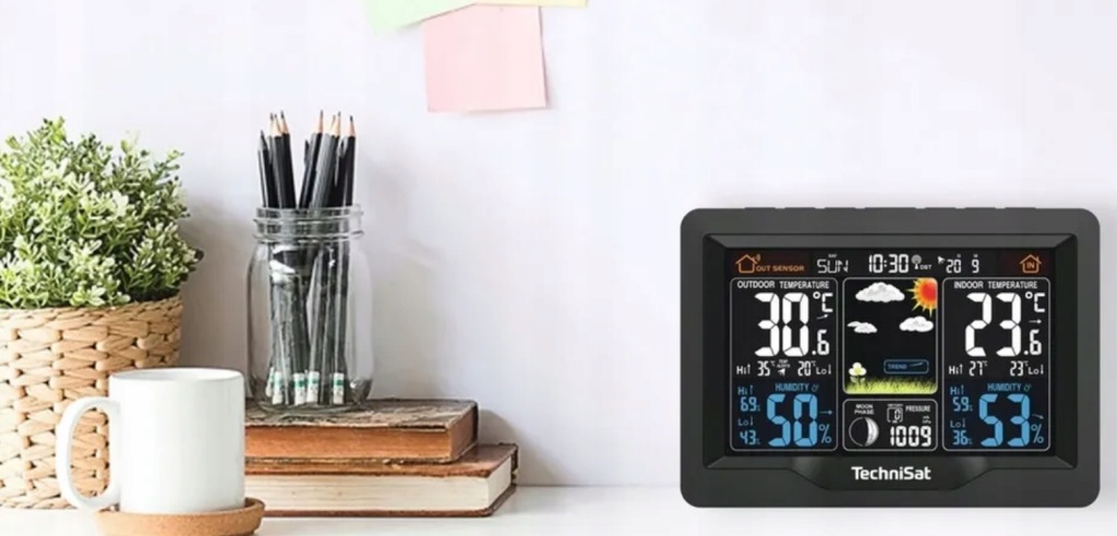 IMETEO X1 будьте в курсі погоди! IMETEO X1-це домашня метеостанція, що дозволяє швидко і точно оцінити поточні і прогнозовані погодні умови зовні будівлі і клімат в приміщенні. Пристрій оснащений чітким кольоровим дисплеєм з підсвічуванням розміром 127 x 97 мм.Температура і вологість на відкритому повітрі вимірюються за допомогою зовнішнього датчика з діапазоном до 60 м. клімат в приміщенні оцінюється за допомогою датчиків, вбудованих в метеостанцію. Крім того, пристрій відображає поточний час на основі контрольованого сигналу DCF77.