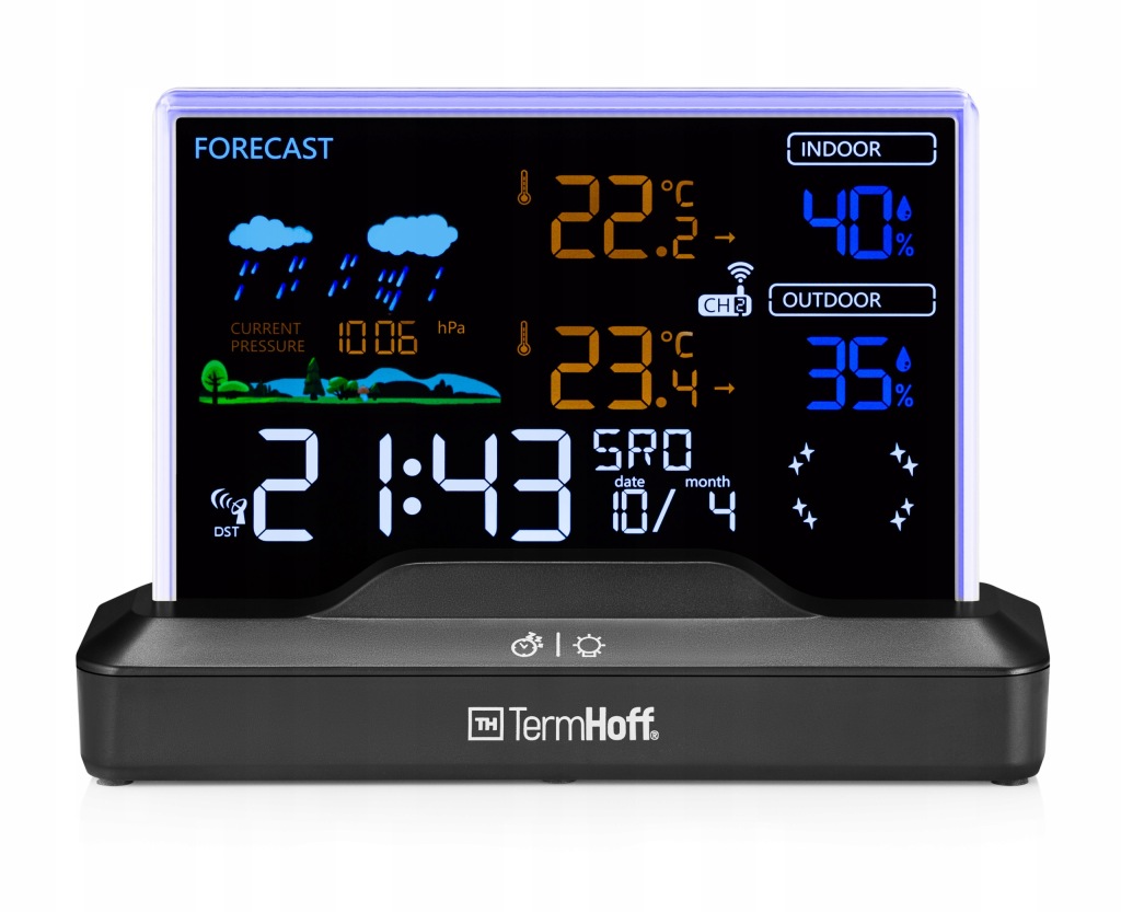 бездротова метеостанція Termhoff TH-WS2 з барометром і додатковим датчиком: він вимірює внутрішню і зовнішню температуру і прогнозує місцевий прогноз погоди, що робить його ідеальним вибором для отримання точних вимірювань, доступних одним поглядом на зручному для читання дисплеї.
