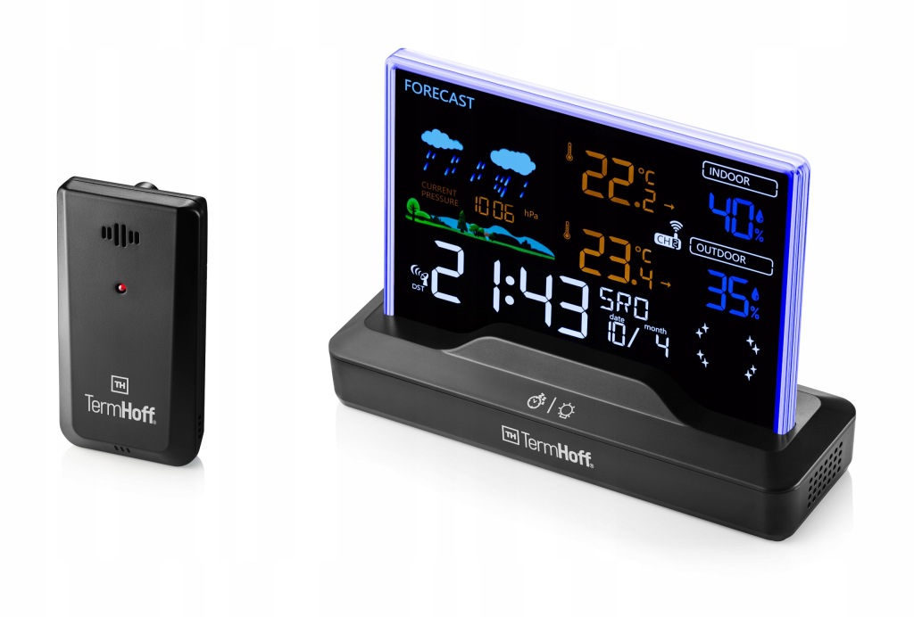 бездротова метеостанція Termhoff TH-WS2 з барометром і додатковим датчиком: він вимірює внутрішню і зовнішню температуру і прогнозує місцевий прогноз погоди, що робить його ідеальним вибором для отримання точних вимірювань, доступних одним поглядом на зручному для читання дисплеї.