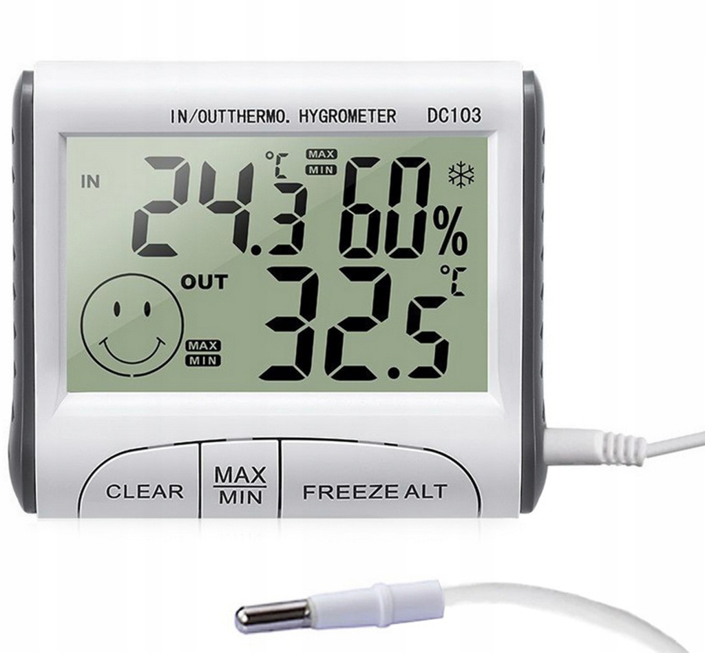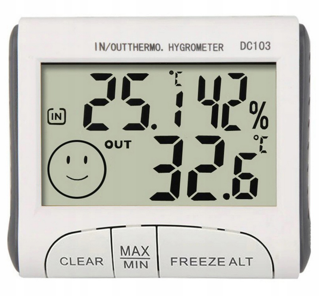 великий і чіткий РК-дисплей , яким оснащений пристрій відображає температуру за шкалою Цельсія або Фаренгейта. крім того, пристрій відображає найнижчі і найвищі значення, записані протягом доби. на екрані ми також знаходимо графічну сигналізацію у вигляді усміхненого або сумного обличчя. посміхається, коли температура знаходиться в межах 18-25 градусів і вологість 40-65% RH. Коли параметри не знаходяться в цих межах, на екрані зʼявляється сумне обличчя.