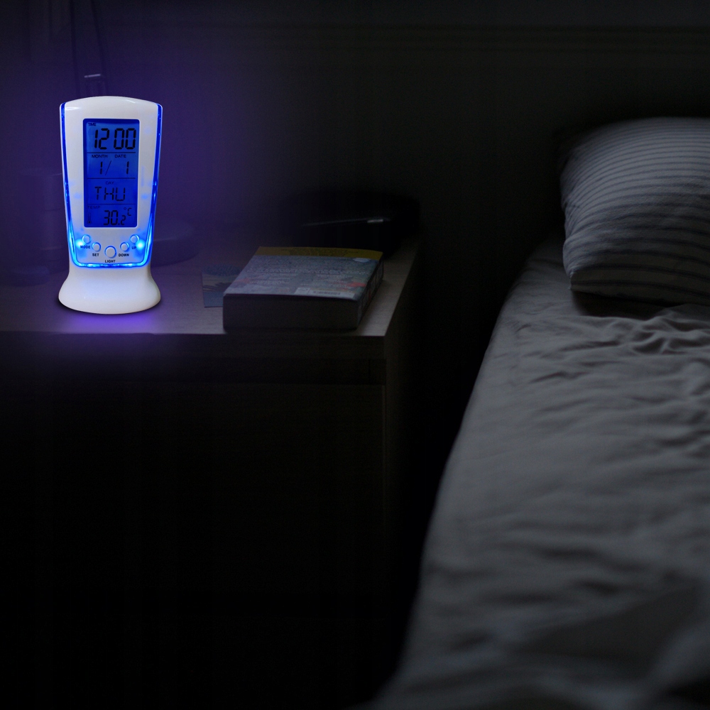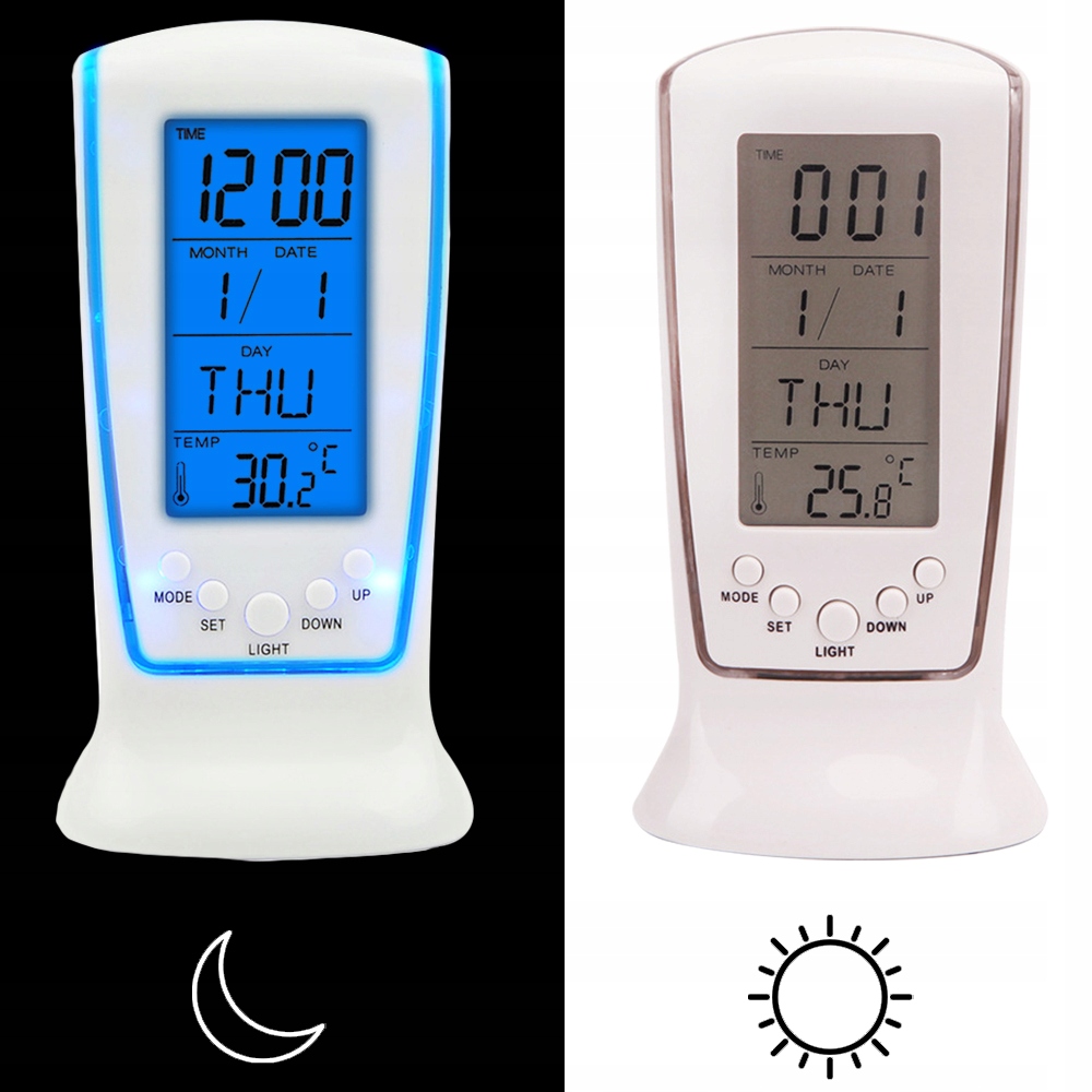 годинник має вбудоване підсвічування екрану , що робить його дуже зручним для читання. Ця функція чудово працює, особливо вночі, коли ми хочемо перевірити час або налаштування будильника, не вмикаючи додаткове світло, яке може порушити сон або розбудити інших членів сімʼї.
