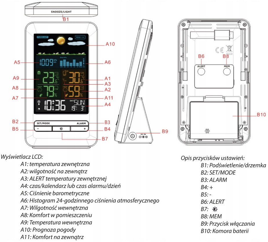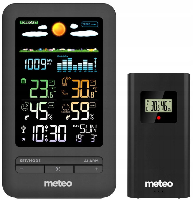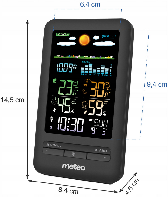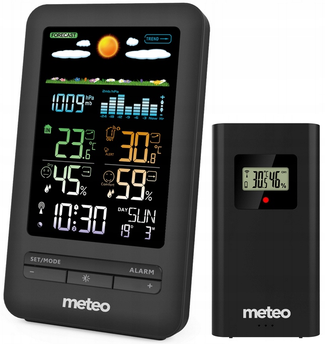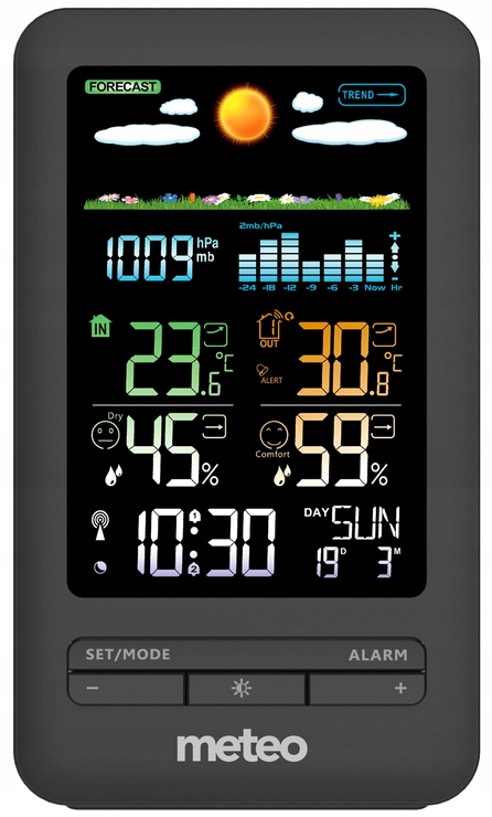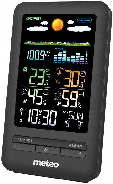 завдяки моніторингу таких параметрів, як: коливання температури, тиску і вологості прогнозує погодні тенденції в найближчі 12-24 години. інформує нас про прогнозовану погоду за допомогою піктограм.