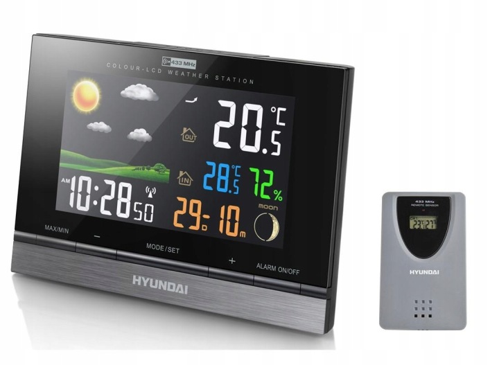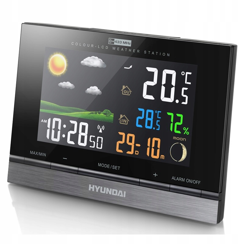 високоякісна метеостанція Hyundai WS2303 буде надійно інформувати вас, серед іншого, про температуру всередині і зовні, вологості повітря або фазах Місяця.