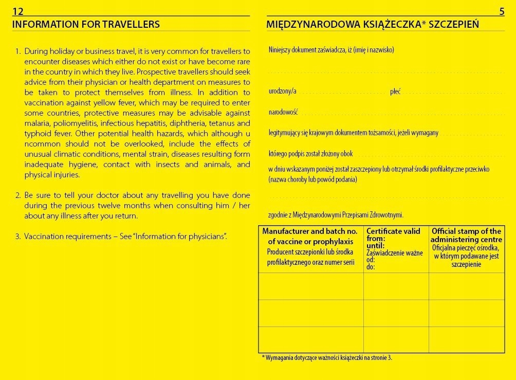 ви хочете відправитися в далеку подорож за межі Європи, де необхідні спеціалізовані щеплення? Вам знадобиться Міжнародна книга вакцинації! У нашій пропозиції є, в друкованому варіанті на жовтої , пофарбованої в масі, папір вагою 120 г.зшита двома скобами. Діюча версія-зразок Всесвітньої організації охорони Здоровʼя