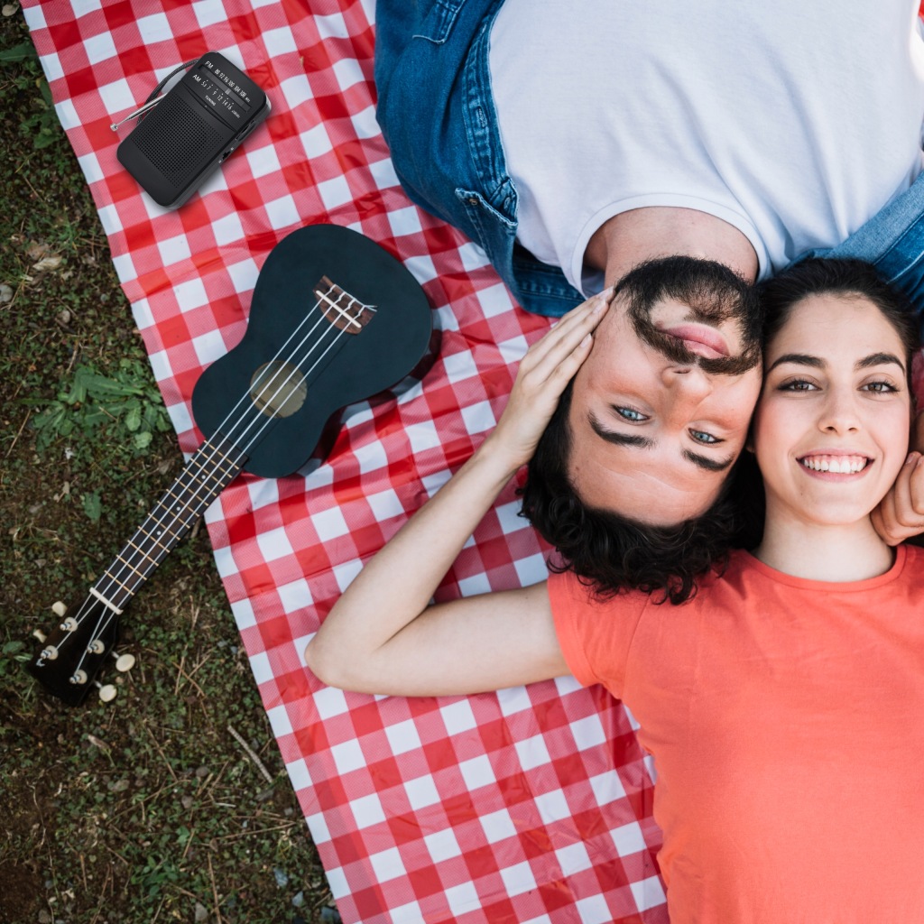компактний радіоприймач з телескопічною антеною і можливістю підключення Bluetooth, що нагадує стиль ретро-пристроїв.