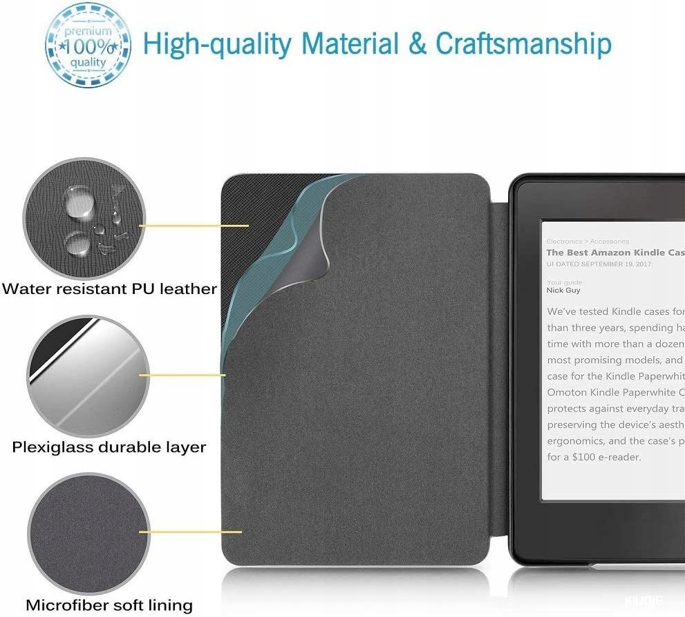 елегантний захисний чохол для читання книг Amazon Kindle Paperwhite 4 виготовлений зі штучної шкіри. Обкладинка дуже легка і ідеально підходить для читання книг. Це чохол, призначений для читання книг однією рукою (завдяки можливості розкладання). Коли упаковка закрита, вона міцно тримається за допомогою магніту, і це навіть без наявності зайвого ременя, як у випадку з іншими чохлами. Цей чохол-найкраще, що ви можете дати своєму читачеві Amazon Kindle Paperwhite 4 .