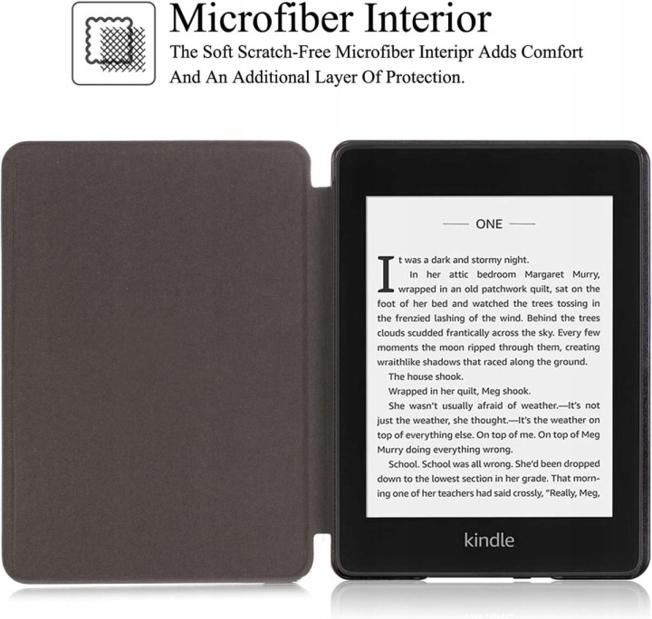 захисний чохол для читання книг Amazon Kindle Paperwhite 4 (2018) . Це класичний, перевірений роками чохол типу durable Lock. Таким чином, ви можете зафіксувати зчитувач в пластиковій ванні і магнітно закрити упаковку . Упаковка пропонує вирізи для всіх елементів керування (кнопка запуску, розʼєм, світлодіод). Матеріал штучна шкіра з обробкою. Корпус зроблений не з гладкої шкіри,а з мʼяко текстурованою. Матеріал внутрішніх панелей замша , що робить його зручним для відображення. Чохол має функцію автоматичного засипання/пробудження в залежності від того, як ви відкриваєте або закриваєте чохол. Також для покоління Paperwhite 5 ми пропонуємо чохол з логотипом KINDLE. Перевагою корпусу є невелика вага, але в той же час надійне виконання завдяки пластиковій ванні.