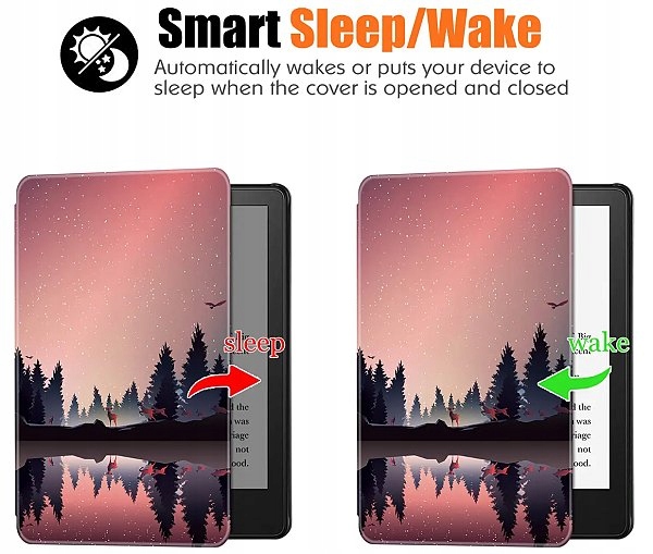 чохол маємагнітне закриття . Габаритні розміри і вага дуже компактні і майже точно копіюють розміри читача. Звичайно, чохол пропонує функцію автоматичного засинання / пробудження читача в залежності від того, як ви відкриваєте або закриваєте чохол. Передні пластини можуть повертатися на 360°, що дозволяє зручно тримати корпус в одній руці. Чохол барвистий, з повним друком, nightlake мотив, з тонкою обробкою. Доступний широкий вибір інших колірних варіантів.