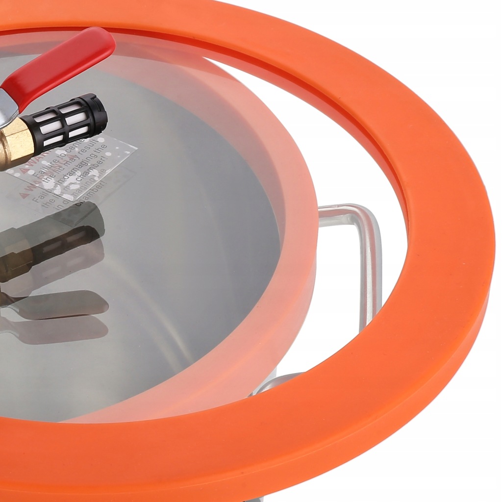 високоякісна вакуумна камера: 11-літрова вакуумна камера оснащена скляною кришкою і гумовим ущільненням для запобігання органічних забруднень і пошкоджень, а також герметичності всієї вакуумної системи. Цілісний корпус з нержавіючої сталі з ручкою легко носити з собою. Два додаткових глушника зменшують шум і створюють більш тиху роботу насоса.