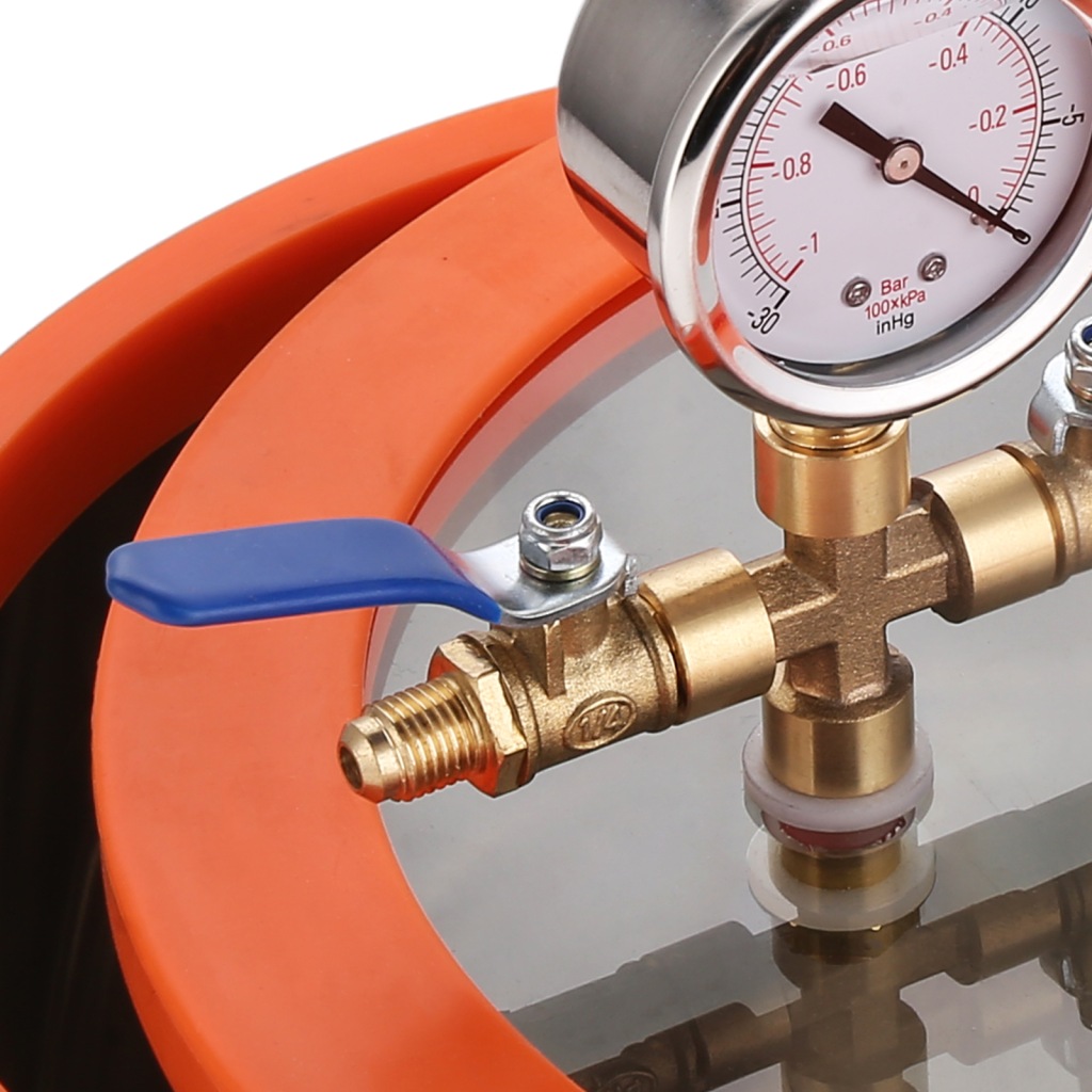 все, що вам потрібно: захист вакуумної камери, кришка зі склопакета, вакуумний манометр, червоний і електричний запірний клапан, герметичні впускні зʼєднання, відкрита заповнена кришка стовбура з відкритим отвором, кульовий клапан вакуумметра, фільтр впуску повітря для вакуумного манометра, тросовий шланг ( гумовий шланг 1,5 м, Внутрішня різьба SAE 0,64 см на обох кінцях), силіконова накладка (20 х 20 см) і пляшка масла 250 мл для вакуумного насоса.