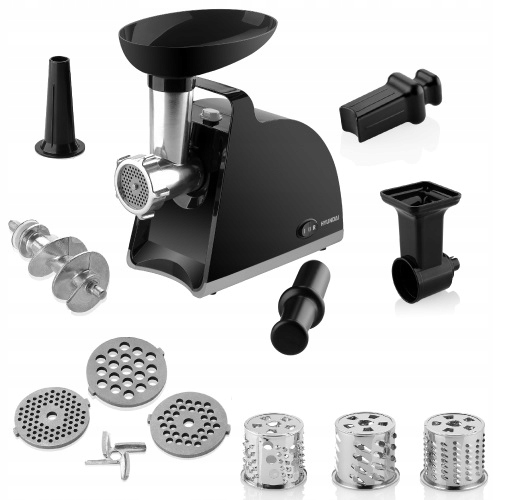 надійний пристрій , для тих, хто хоче приготувати власні ковбаси та фарш. мʼясорубка оснащена приладдям для: грубого помелу, середнього помелу , дрібного помелу, приготування ковбаси, подрібнювача, . Все це буде зроблено з міцних матеріалів, які легко розібрати і очистити. Користувач має на вибір 2 передачі (вперед і назад). Машина використовує стандартну потужність 1000W.