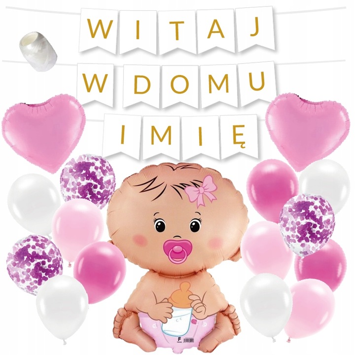 ⭐ 2 повітряні кулі серця світло - рожевий 45 см⭐ повітряна куля з фольги - маленька дівчинка 61 см⭐ 20 м білої стрічки для повітряних куль⭐ 2 гачка - незамінна допомога для підвішування гірлянди-витримує до 1 кг прикраси