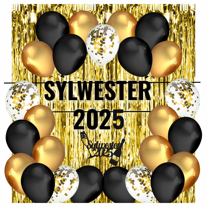 - повітряні кулі: 5 прозорих конфетті, 10 металевих злотих і 10 металевих чорних, кожен досягає 30 см у висоту при наповненні повітрям. Повітряні кулі не плавають при заповненні гелієм.