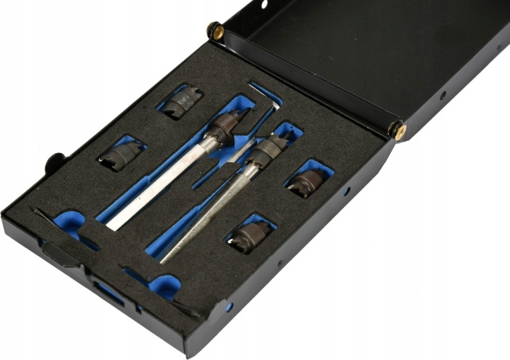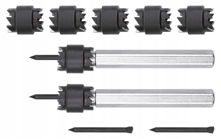 містить 6 двосторонніх корончатых різців (по 3 шт.8мм і 10мм), два фіксуючих патронаі 2 фіксуючих стрижня .