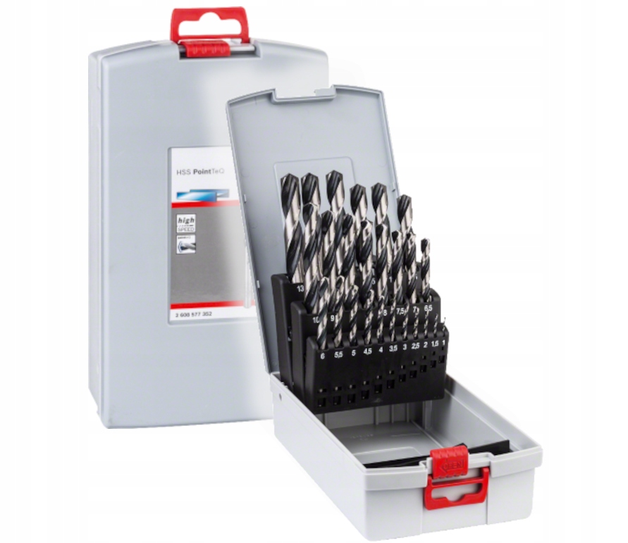 набір з 25 свердел HSS PointTeQ від Bosch упакований в пластиковий чохол , який захищає Свердла від пошкоджень при зберіганні і транспортуванні. Описані отвори для свердел дозволяють швидко знайти відповідне свердло і зберегти порядок.