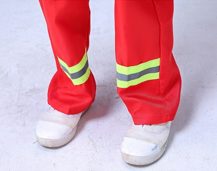- костюм виконаний в красивому червоному кольорі з яскравими відбивають смугами,