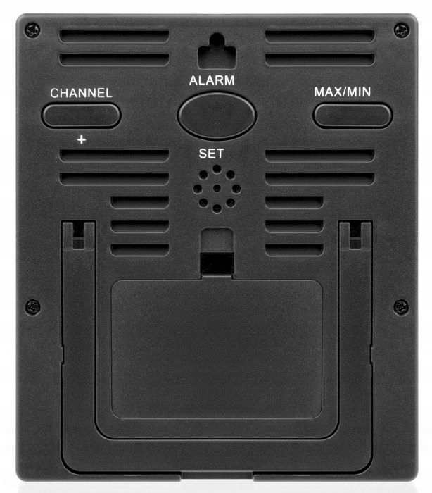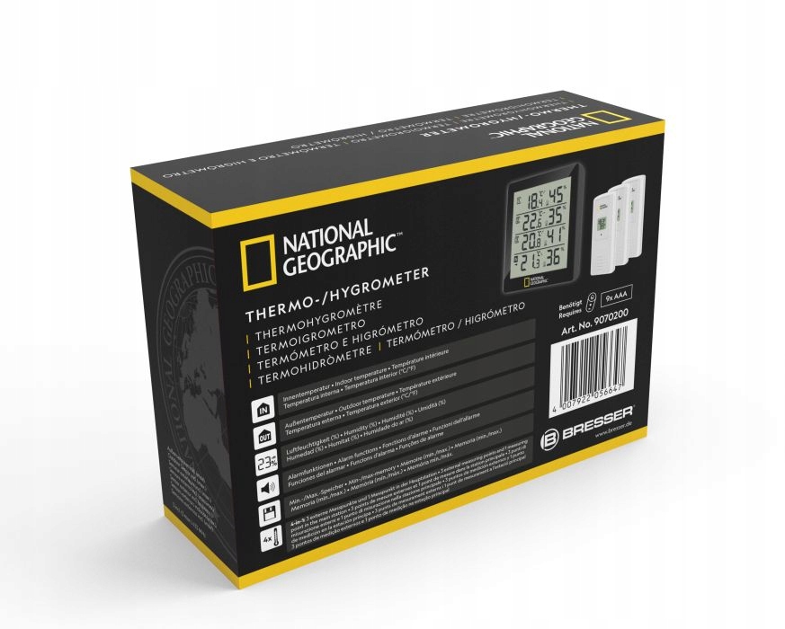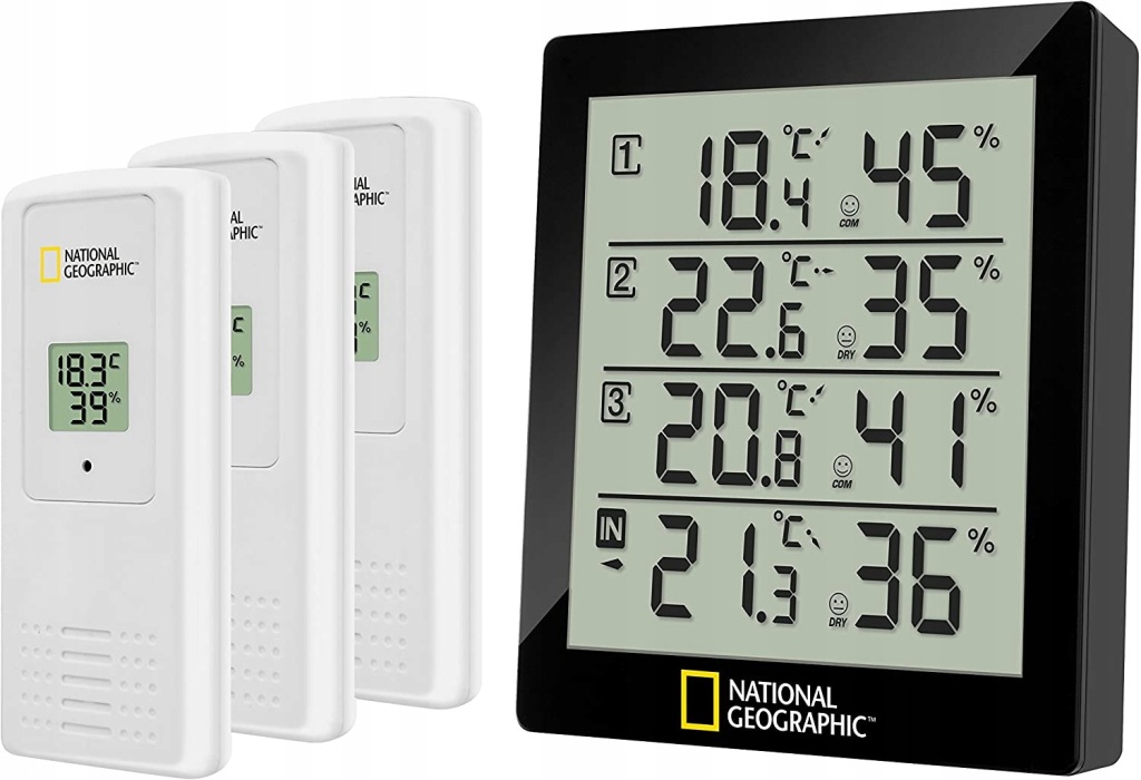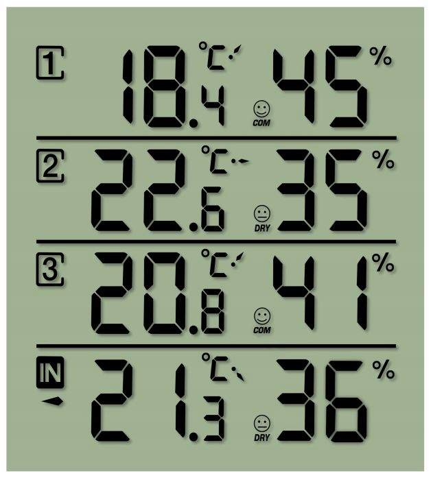 - маркувальна точка : 4 результату вимірювання температури, 4 результату вимірювання відносної вологості, термогігрометричний датчик (3 штуки в комплекті) для установки або підвішування. Частота передачі 433 МГц, розміри і вага базової станції 10,4 x 11,9 x 2,5 см, 152 г, обсяг поставки: термогігрометр, 3 дистанційних датчика, Керівництво по експлуатації, порада: використовуйте тільки рекомендовані батареї. Завжди замінюйте слабкі або порожні батареї новими батареями повної ємності. Не використовуйте батареї різних марок або ємності. Батареї слід вийняти з пристрою, якщо вони не використовуються протягом тривалого часу.