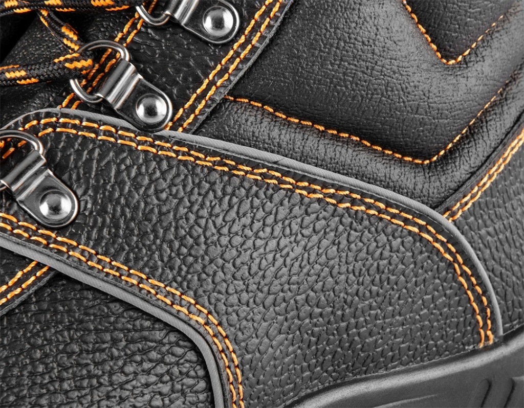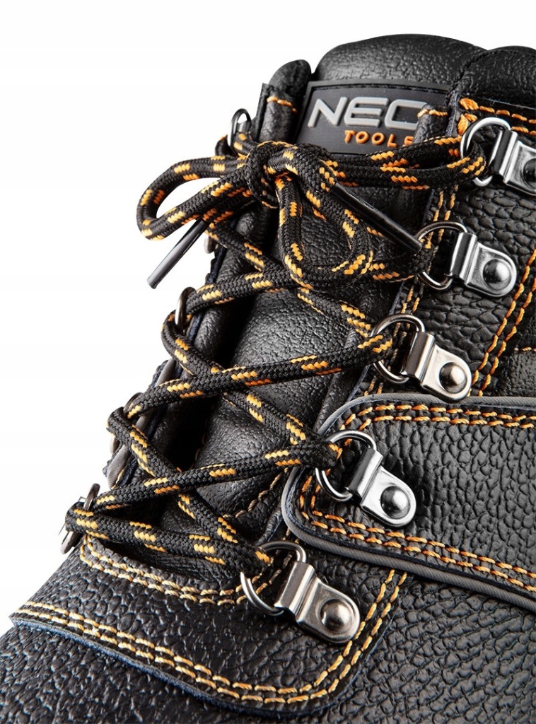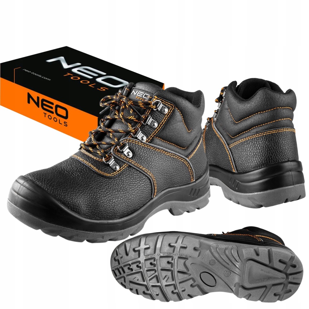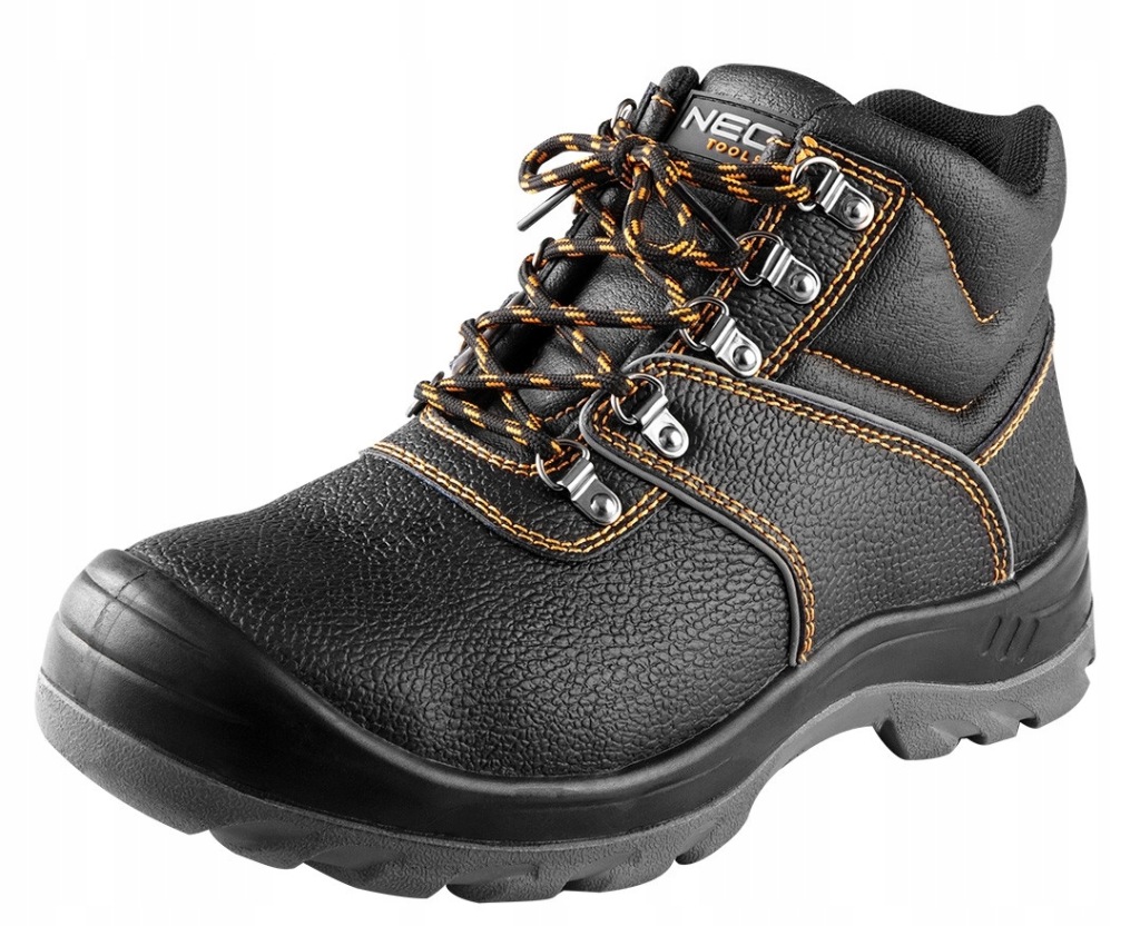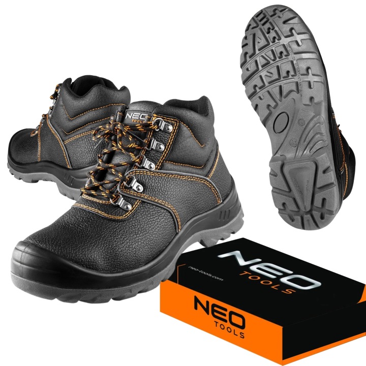 шкіряні черевики S3 SRC, сталевий носок, сталева вставка з захистом від проколів,82-166 марки NEO-це робочі черевики класу S3 src, оснащені шкіряним верхом з тисненого спилка, металевими петлями і подвійними і потрійними швами, що підсилюють конструкцію. Сталевий носок забезпечує захист від ударів з енергією 200 Дж, а устілка з захистом від проколів з того ж матеріалу захищає нижню частину стопи. Взуття має вбудований каблук, двоматеріальну підошву і стійкість до масел, бензину та інших органічних розчинників. Вони характеризуються антиелектростатичними властивостями. Проникність і поглинання води в пʼяткової частини відповідають класифікації безпечної взуття відповідно до стандарту EN ISO 20345. Чоботи бувають різних розмірів.