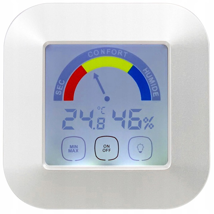 - функції: вимірювання температури повітря, вимірювання вологості повітря, запис максимальної і мінімальної температури і вологості повітря, прогноз температури і вологості повітря, температура в °C або °f, 8 рівнів вологості