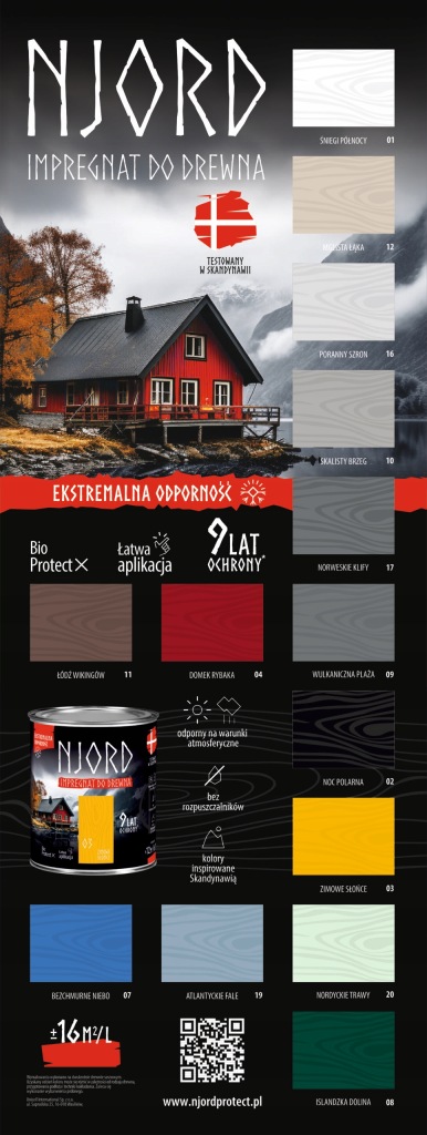 Njord просочення для дерева-це просочення екстремальної стійкості, призначена для захисно-декоративного фарбування деревʼяних поверхонь як зовні, наприклад, фасадів, навісів, альтанок, парканів, так і для предметів, що знаходяться всередині приміщень, наприклад меблів, панелей. Виріб не призначений для плоских поверхонь типу підлог, терас, дахів (черепиці). просочення створює дуже міцне і гнучке покриття, стійке до атмосферних впливів, цвілі і вологи. Володіє гідрофобними властивостями. Характеризується хорошою непрозорістю, акцентуючи при цьому малюнок волокон і надаючи атласну обробку.