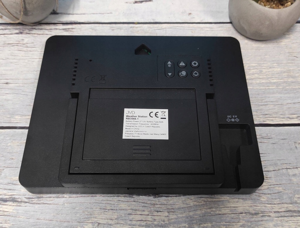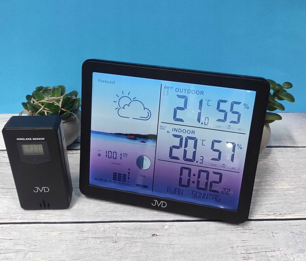 Освітлена метеостанція JVD RB3566.1. Прогноз погоди, барометр, термометр, гігрометр. Температурні сигнали. Показники комфорту і ризику появи цвілі. Тенденції зміни тиску, температури і вологості. Два розширених сигналу тривоги. Годинник з радіокеруванням