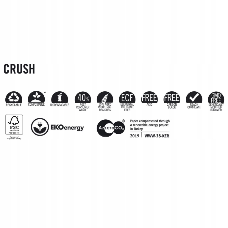 Папір Crush сертифікована для зниження негативного впливу виробництва на навколишнє середовище і не містить ГМО, містить 40% перероблених відходів, а енергія, яка використовується для її виробництва, на 100% надходить з поновлюваних джерел. Вуглецевий слід зменшується на 20% за рахунок використання побічних продуктів і 100% відновлюваної енергії. Будь-які неминучі викиди, що виникають при виробництві цього екологічно чистого паперу, повністю компенсуються надлишковими викидами вуглекислого газу, що використовуються для фінансування заходів, що дозволяють поглинати CO2 в атмосфері.
