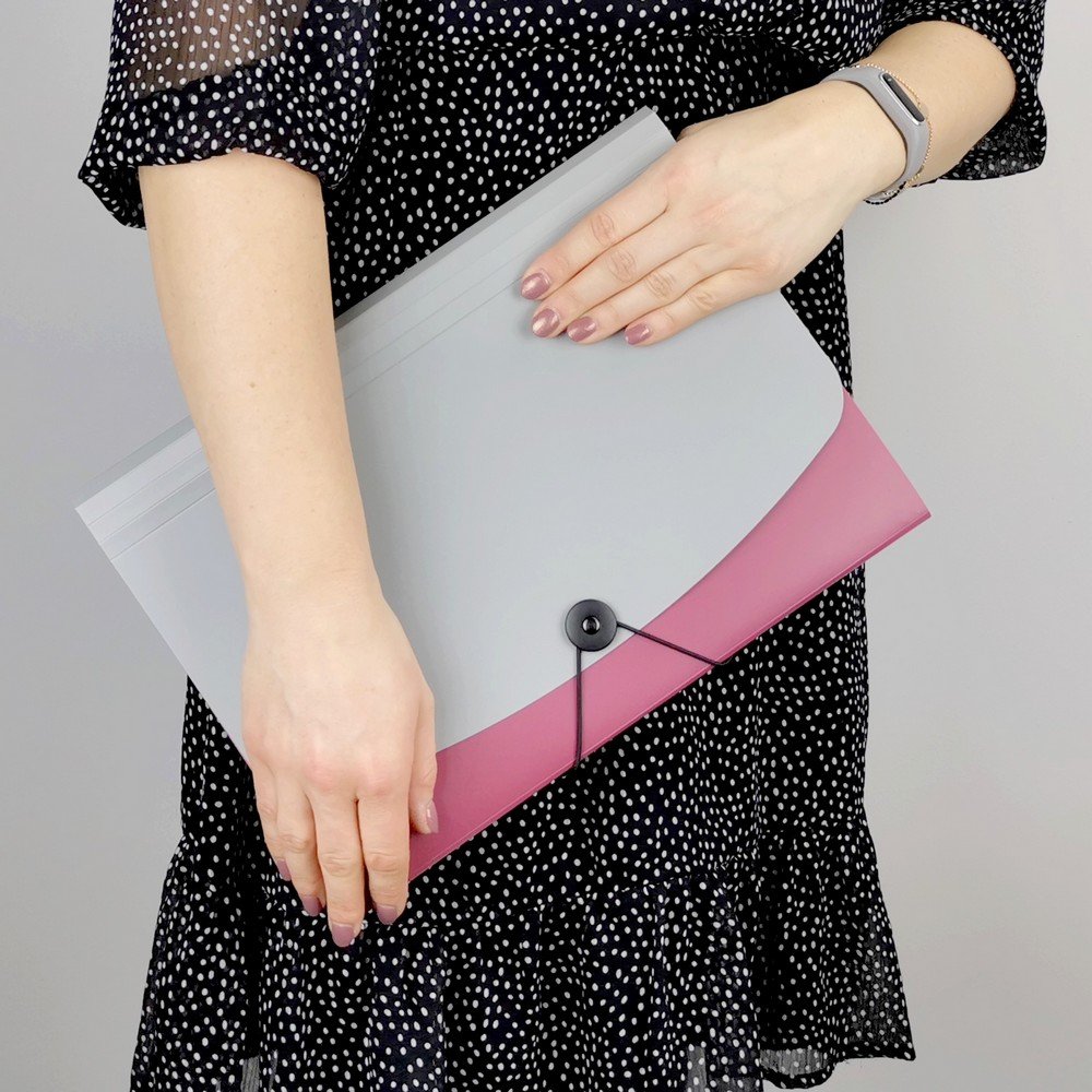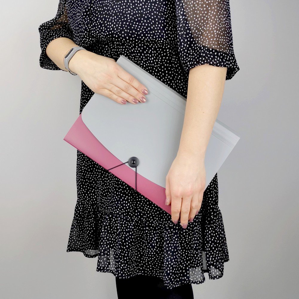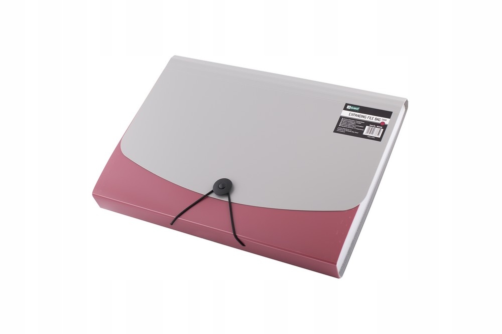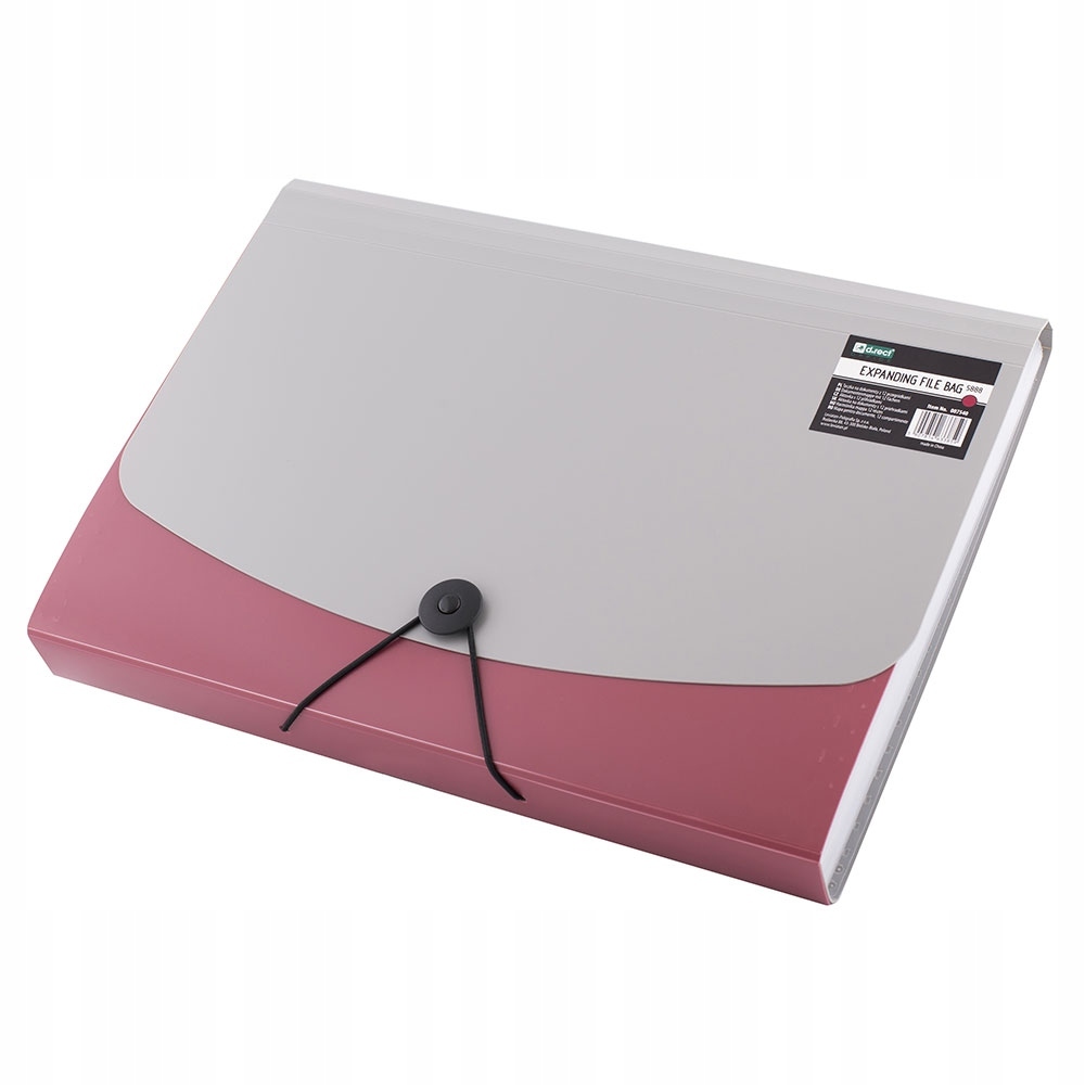 - папка для документів формату А4, закривається на гумку - всередині є відсіки для документів зі змінними етикетками для опису вмісту - передня частина виготовлена з міцної поліпропіленової плівки червоного кольору, задня частина і закриття сріблястого кольору - 12 відсіків