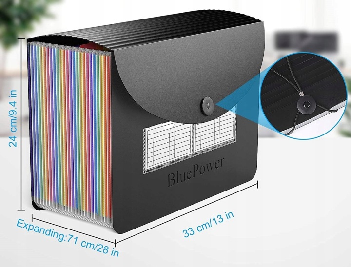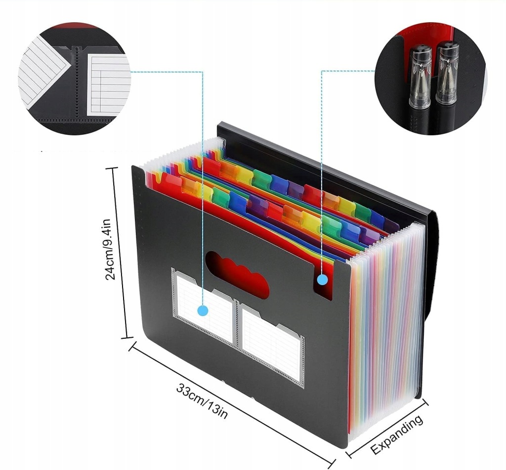 має 24 кольорових кишені для документів формату А4, в кишеню можна легко покласти до 3000 аркушів паперу
