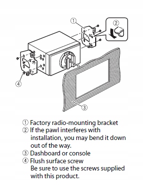 щоб не пошкодити приладову панель або пристрій (так як під час руху екран може вібрувати і напружувати або навіть пошкодити приладову панель) установка вимагає використання оригінальних кронштейнів від автомобіля або спеціального монтажного комплекту, в якому головний пристрій кріпиться болтами до приладової панелі.