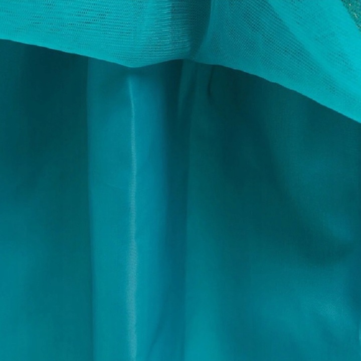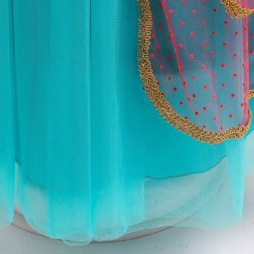 ⭐ сукня має широкий Бірюзовий низ, прикрашений червоним тюлем в горошок і злотим кантом. Верх сукніприкрашений тюлевими оборками, які підкреслюють неповторний східний характер вбрання .