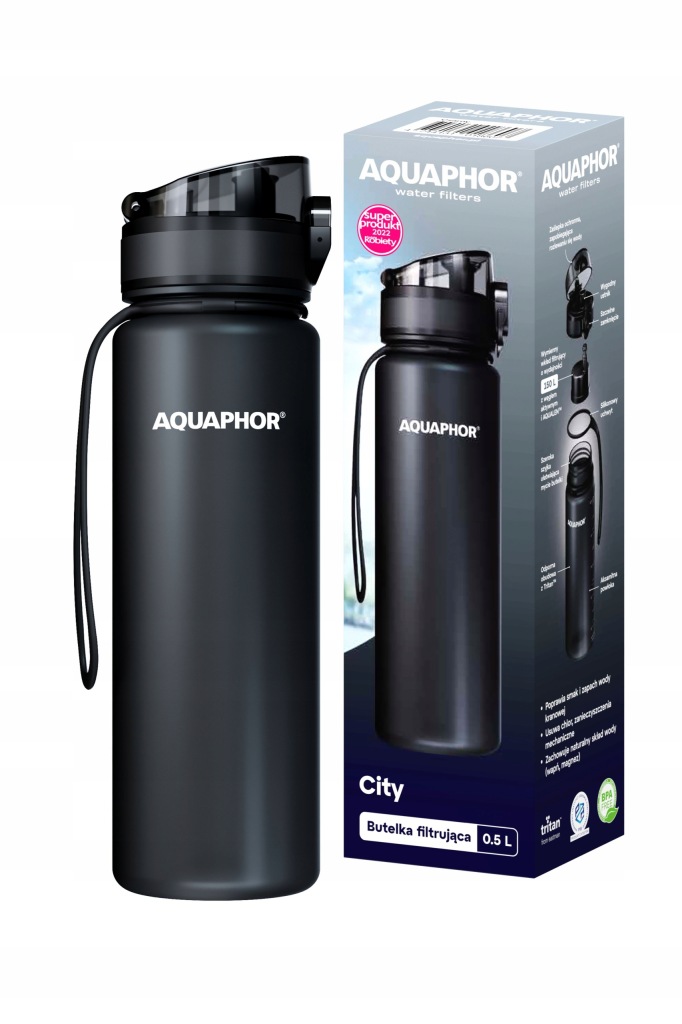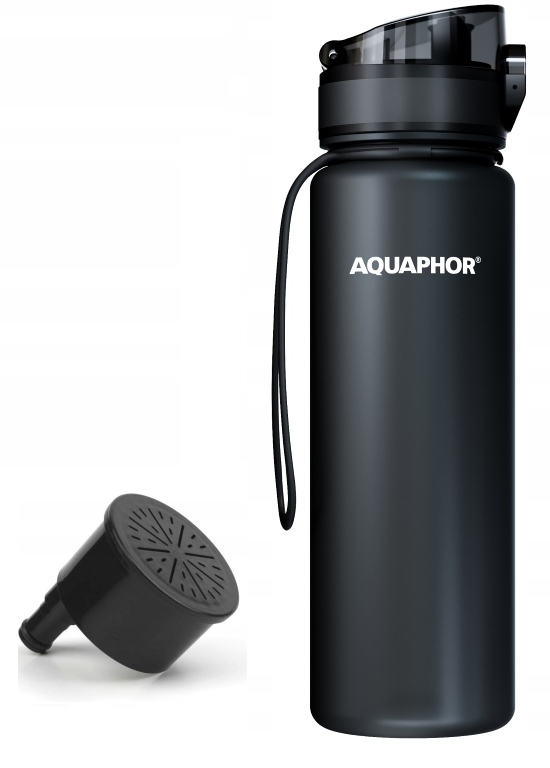 пляшка Aquaphor City оснащена унікальним щомісячним змінним вугільним фільтром (100% натуральна фільтруюча середовище, виготовлена з шкаралупи кокосового горіха). Він видаляє неприємний смак і запах хлору з водопровідної води. Він залишає незмінним кількість мінералів, природно присутніх в ньому (в основному кальцію і магнію), завдяки чому вода зберігає цінні для здоровʼя елементи. Він трохи підвищує pH води, що впливає на її якість. Він виготовлений з міцного пластику. Він повністю позбавлений шкідливого бісфенолу А і дозволений до контакту з водою на підставі відповідних сертифікатів.
