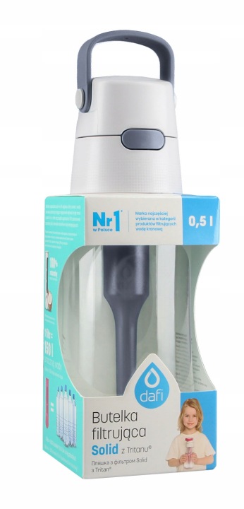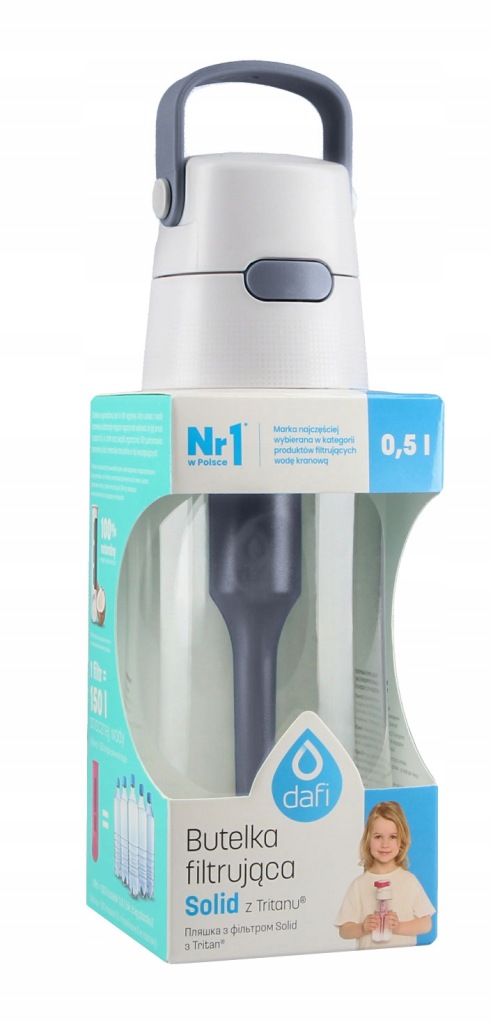 пропонована пляшка Dafi Solid має ємність 0,5 л, тому вона працює щодня – вона не надто важка, і в той же час запас води достатній для задоволення спраги. Завдяки їй ми відмовляємося від покупки води в одноразовому пластику і захищаємо навколишнє середовище. Це також велика економія, оскільки одного фільтра достатньо, щоб очистити до 150 літрів води.
