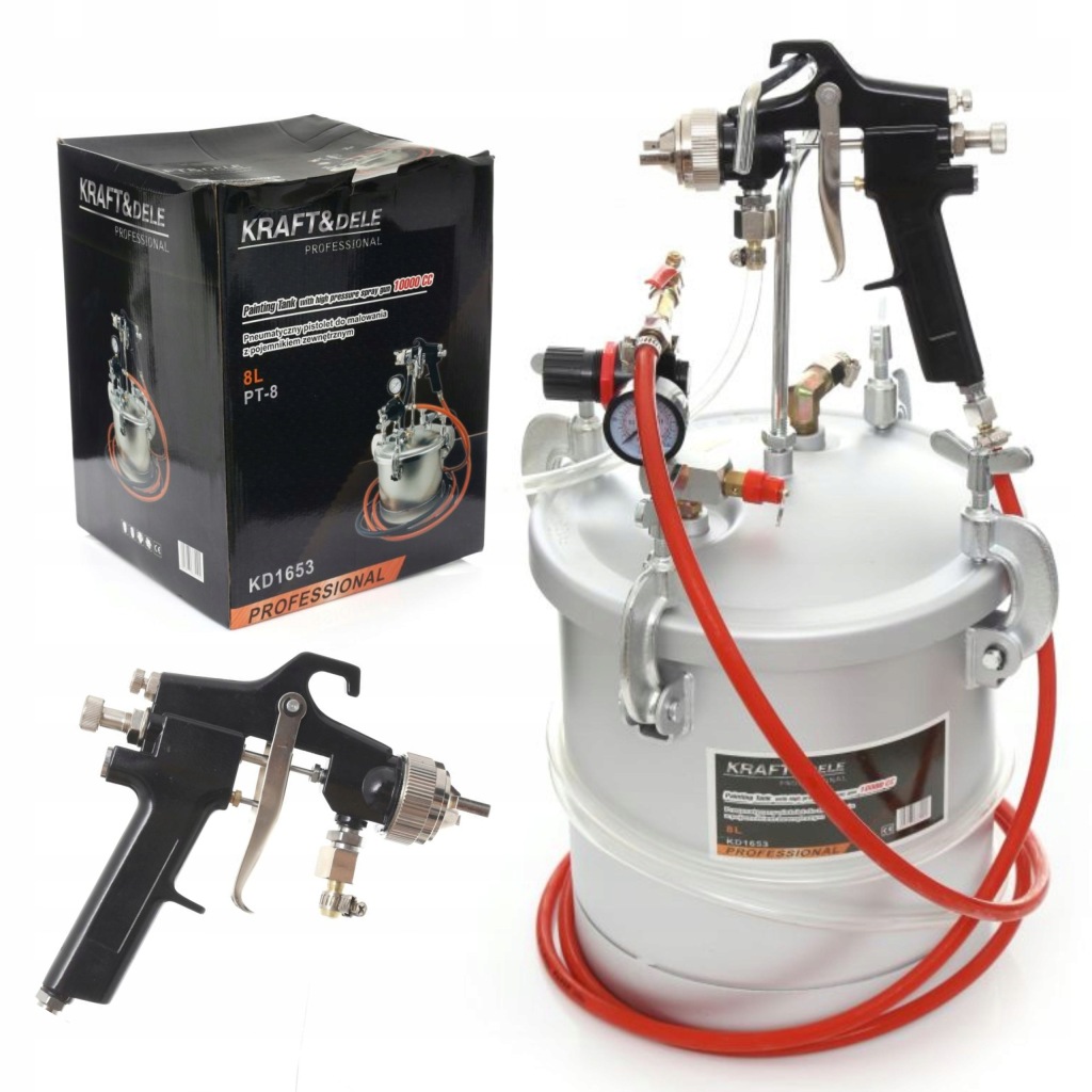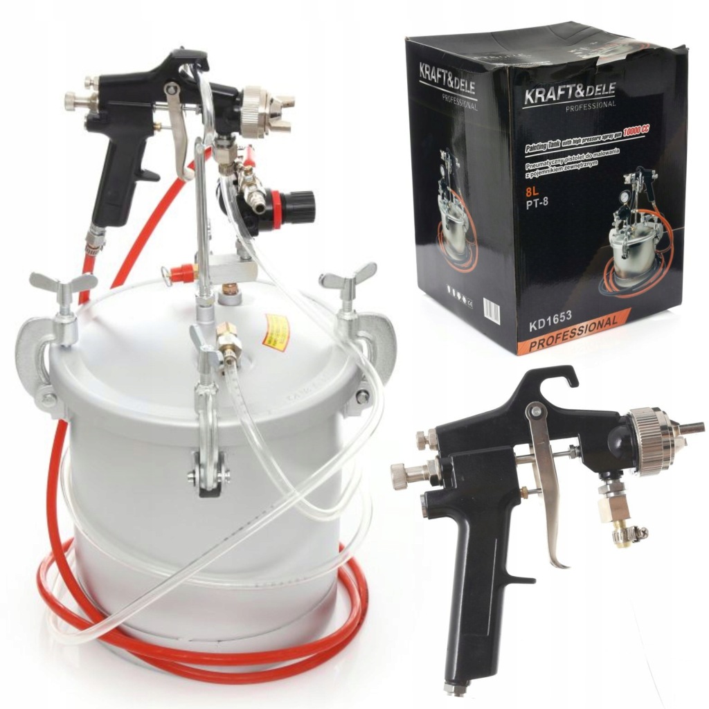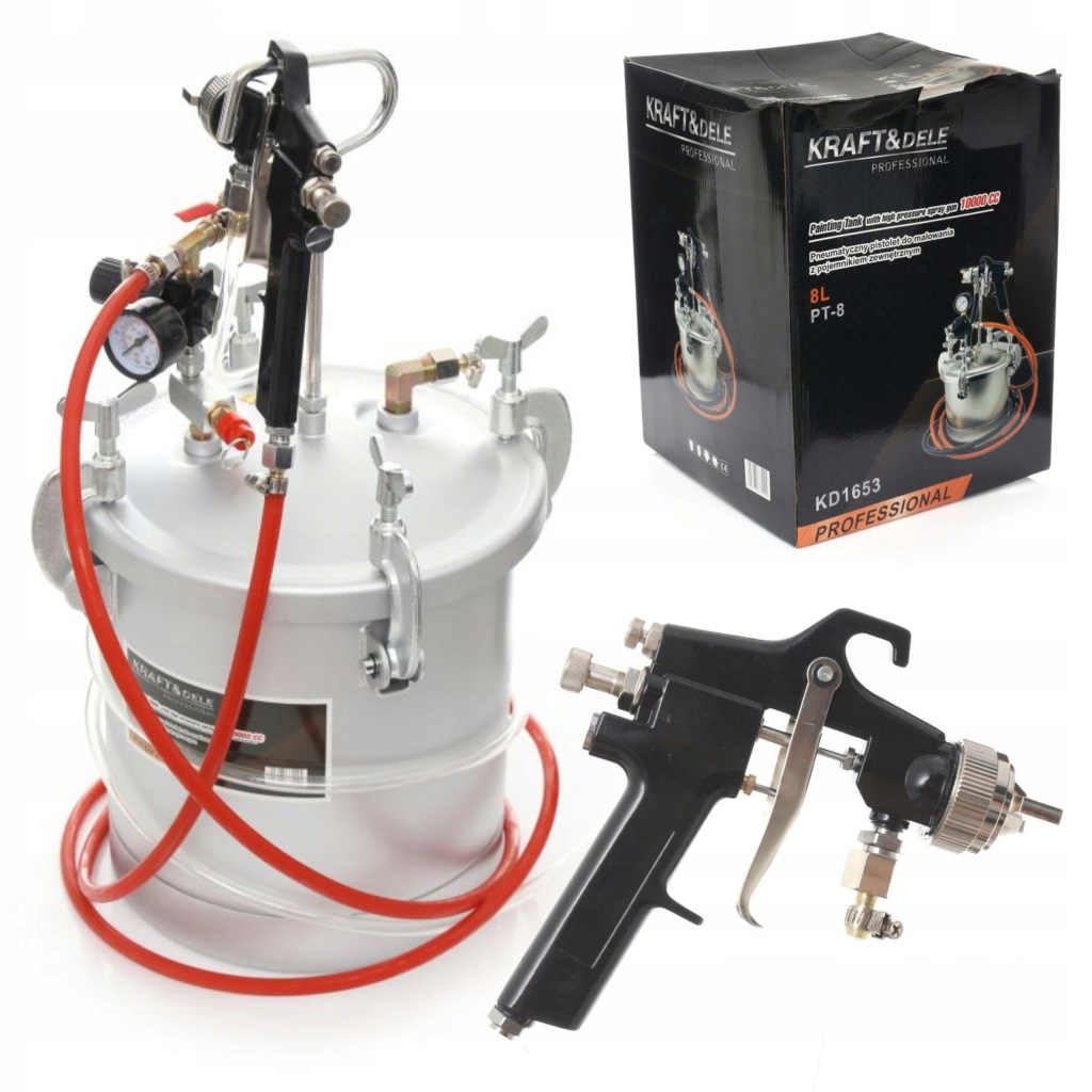- пневматичний фарборозпилювач з зовнішнім резервуаром 8 л - ідеальний комплект для роботи на відкритому повітрі і на великих площах.Чи>