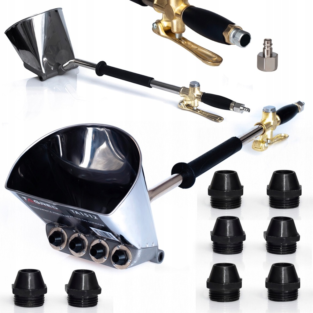 до комплекту ми даємо додатковий комплект з 8 Металевих насадок, угвинчуються на різьбу! ми даємо 4 насадки 11 мм + 4 насадки 7 мм, завдяки чому набір ідеально підходить для розпилення штукатурки більшістю типових штукатурок і кладок розчинів: рідкісних і напів-щільних штукатурних розчинів: машинних, глиняних, цементно-вапняних.ці насадки набагато краще пластикових насадок для шплінта, які важко замінити під час роботи. Металеві міцні насадки забезпечують комфорт роботи і тривалий термін служби.