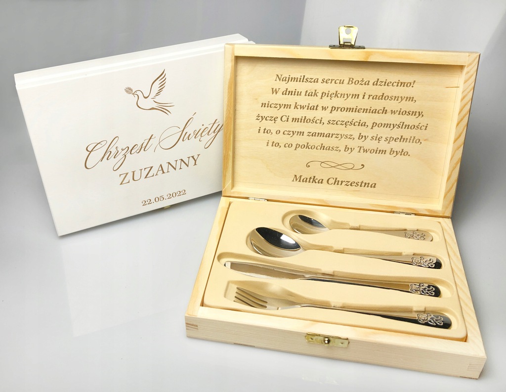 ПОДАРУНОК НА ВОДОХРЕЩА СВЯТИЙ СТОЛОВІ ПРИБОРИ В ДЕРЕВ`ЯНІЙ КОРОБЦІ З ГРАВІЮВАННЯМ ВКУСНЯШКИ