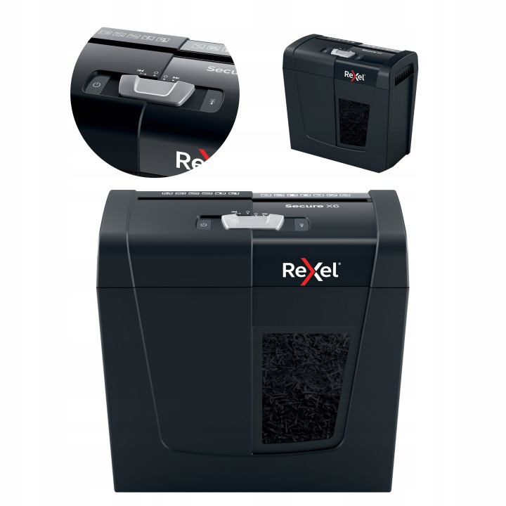 лінійка подрібнювачів Rexel Secure Whisper-Shred™ ідеально підходить для знищення особистих документів і конфіденційної інформації в домашніх умовах. Модель Secure X6знищує одночасно - після