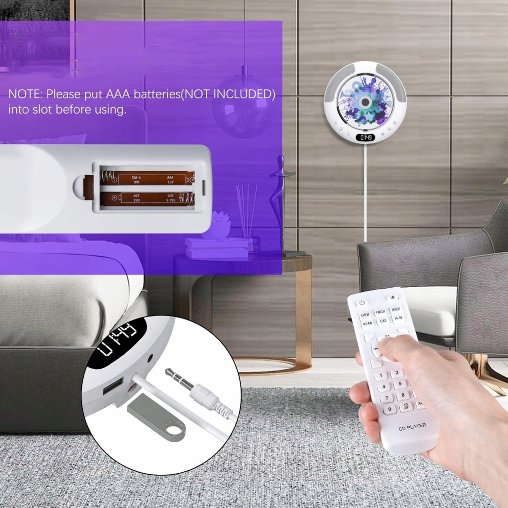- домашній CD-плеєр поставляється з настінним монтажним комплектом і кронштейном для плити/стільниці, який легко монтується на стіну для економії місця або просто поміщається на стіл, що робить ваш будинок більш елегантним і художнім.