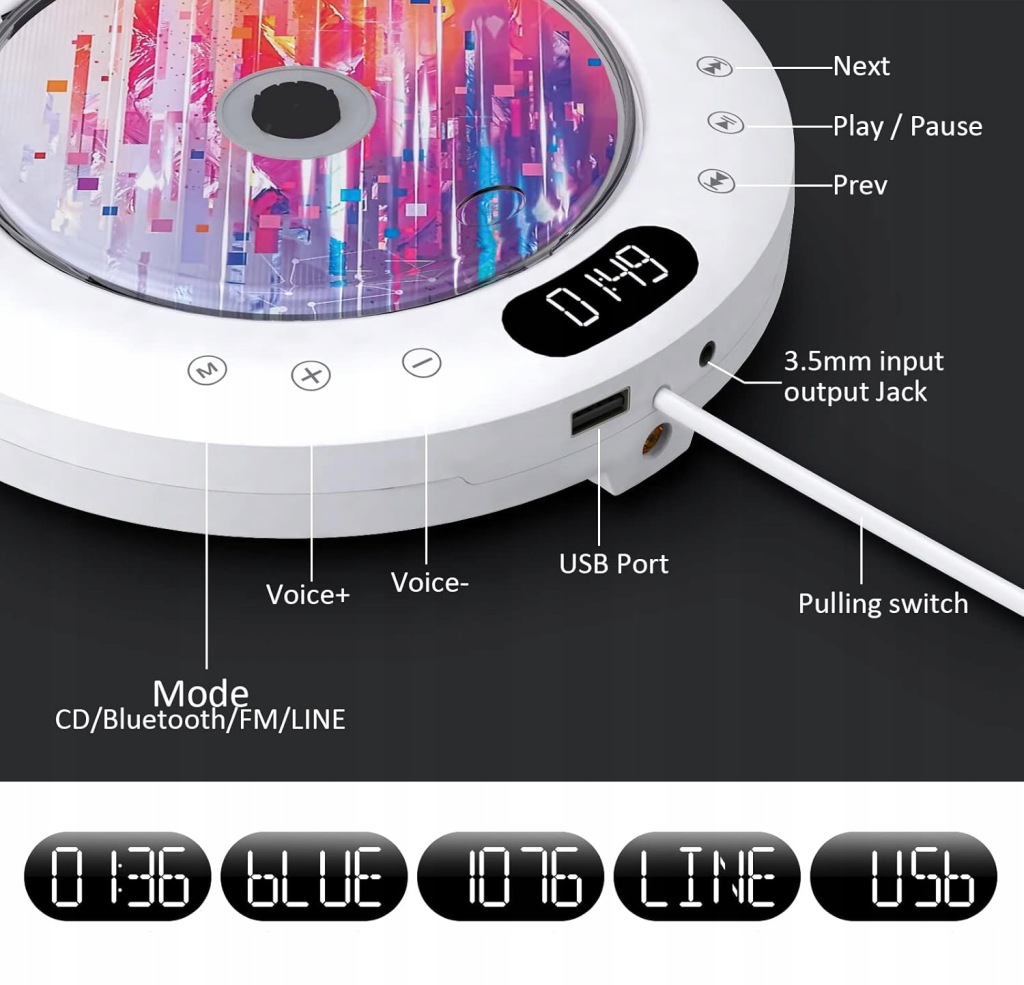 - CD-плеєр Bluetooth має вбудовані сенсорні кнопки, підтримує формати audio CD,CD-R, CD-RW, MP3, WMA, WAV для відтворення компакт-дисків, а також може відтворюватися через Bluetooth, USB .