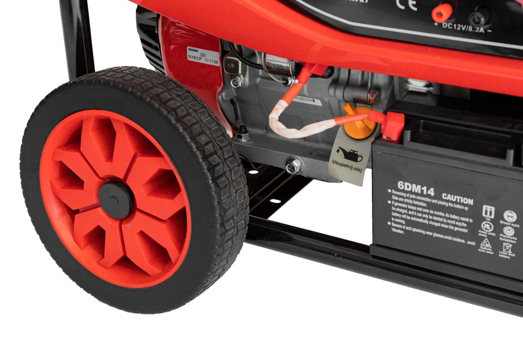 цей агрегат неймовірно зручний в транспортуванні. Зручна ручка і великі колеса дозволяють транспортувати генератор в будь-яке місце, щоб він не заважав під час виконуваних дій і ніщо не представляло для нього небезпеки. Крім того, для захисту від перегріву в ньому використовується повітряне охолодження.