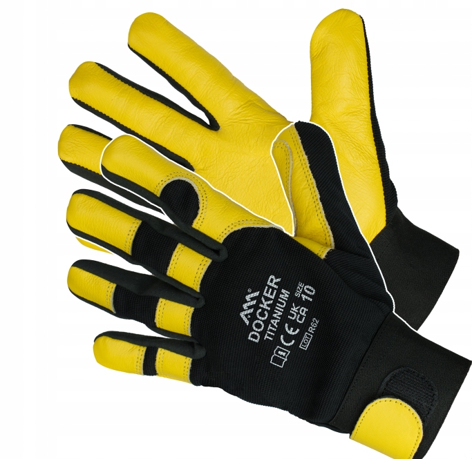 захисні рукавички, пʼятипальцеві, виготовлені з високоякісноїкоровʼячої натуральної шкіри в жовтої кольору, на спинній частині еластична трикотажна тканина з додаванням спандекса в колір cz arnym .