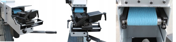 ✅ просте і швидке натяг стрічки забезпечується рукояткою, встановленої на корпусі шліфувальної машини. Зірочка, розташована біля рукоятки, дозволяє центрувати стрічку на ролику і гумовому колесі.