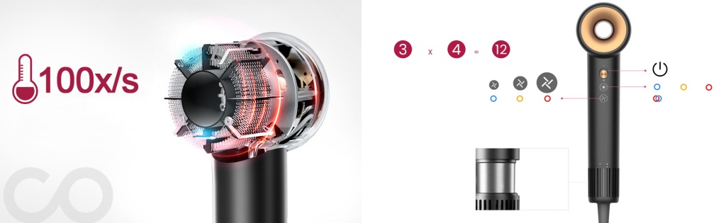 - надзвичайно інноваційний фен з потужністю до110 000 обертів за хвилину завдяки використанню безщіткового двигуна .