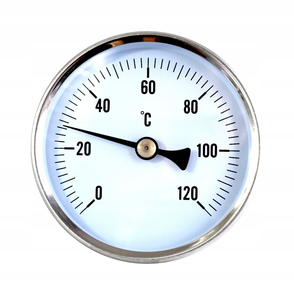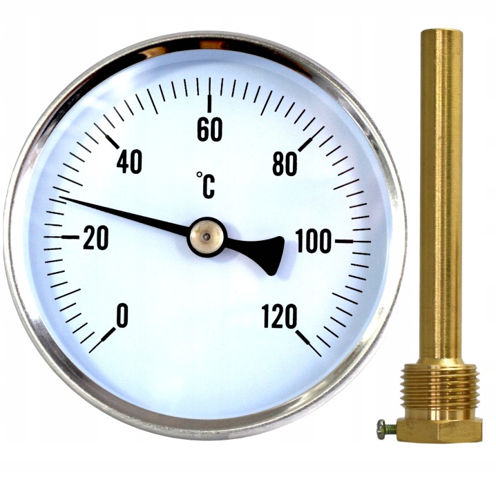 задній біметалічний механічний термометр, кришка довжиною 100 мм з різьбленням GZ1 / 2", Діапазон вимірювання 0...120°C, монтажна кришка в комплекті, діаметр диска 80 мм. знайшов застосування в гільзах і коптильнях, де якість виробів залежить від температури