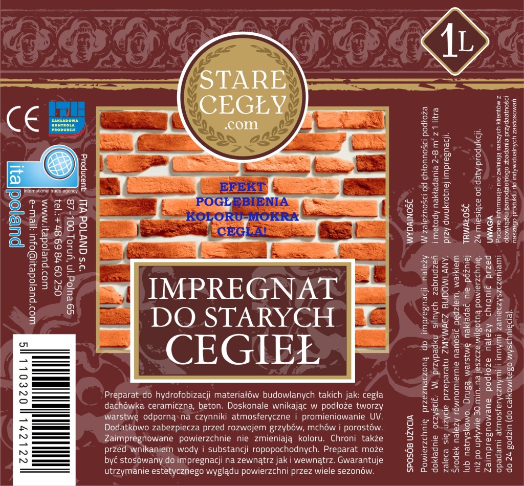 цей засіб призначений для гідрофобізації старої цегли та плитки зі старої цегли. Агент глибоко проникаючи в субстрат, утворює шар, що захищає від розливів, плям, атмосферних впливів і ультрафіолетового випромінювання. Крім того, він захищає від утворення грибків, мохів і лишайників. Поверхні, просочені препаратом, не змінюють колір. Він також захищає від проникнення води і нафтопродуктів в надра. Засіб ефективний як зовні, так і всередині. Забезпечує підтримку естетичного вигляду і підкреслює колір поверхні протягом багатьох сезонів.