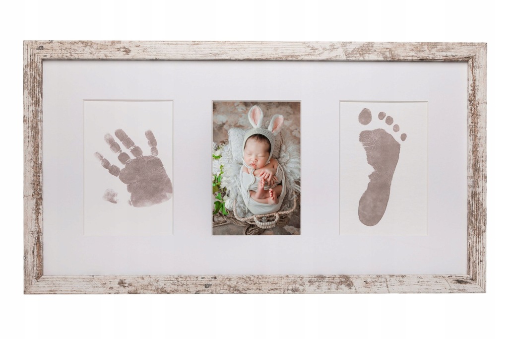 фоторамка ,в якій ми помістимо два відбитка ручки /ноги дитини і1 фотографію (10x15 см) .