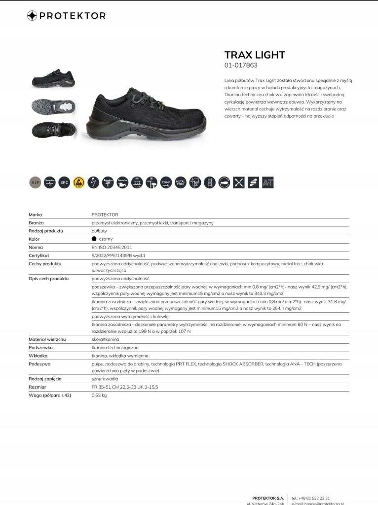 взуття TRAX LIGHT відповідає стандарту EN ISO 20345: 2011, сертифікована IPS-1493 - 44/2021 Вид. 1 і ряд наших власних унікальних технологій.