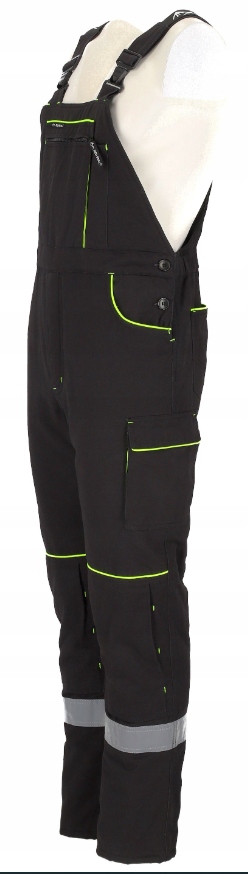 - комбінезон чорного кольору без маркування з естетичними жовто-селадонними вставками в просторових кишенях. У них є два плоских кишені ззаду, дві бічні кишені, Великий обʼємний кишеню на стегні з клапаном, великий кишеню для документів на грудях, на блискавці, подвійний кишеню з рулеткою і шлевкой для інструментів