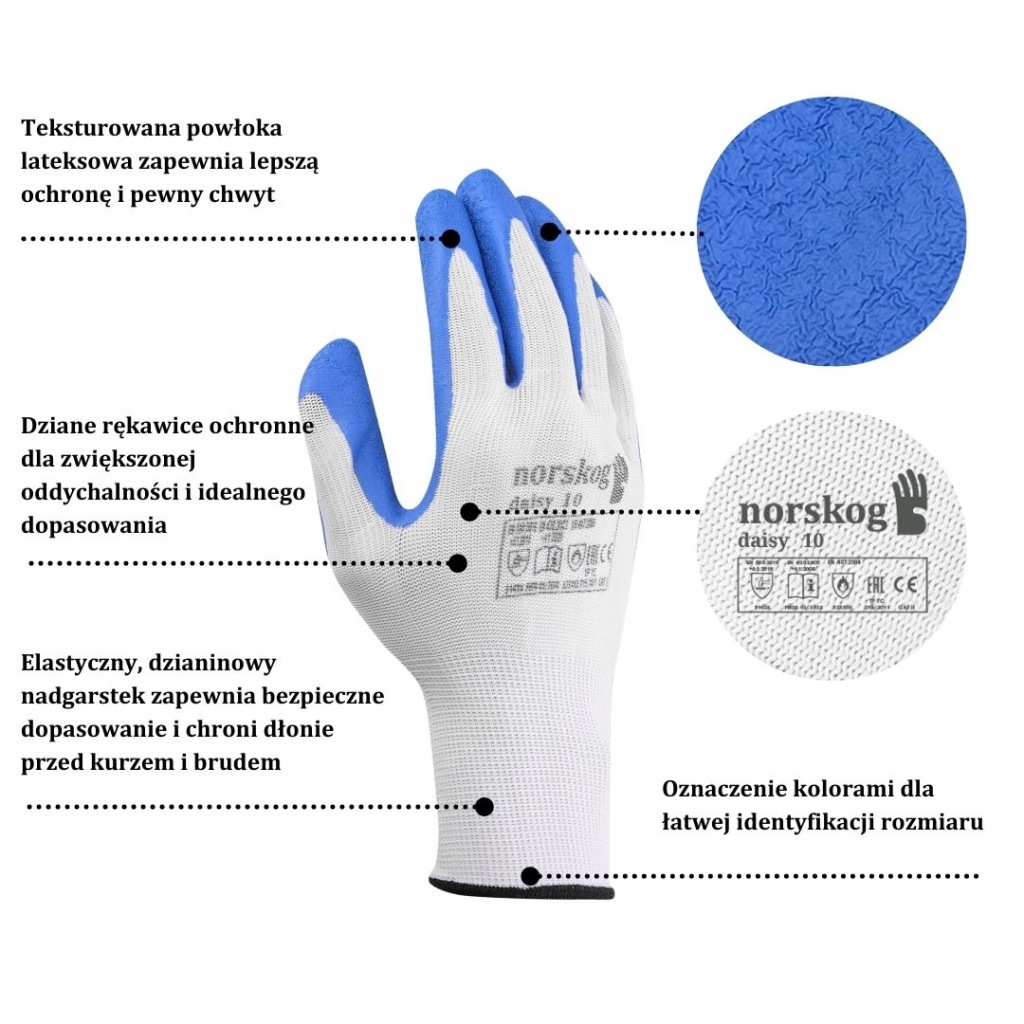 універсальні робочі рукавички Norskog Daisy мають тонку нейлонову вставку, ідеально прилягає до руки. Частина захоплення покрита шорстким водонепроникним латексом, який гарантує хороший захоплення і відчуття утримуваних предметів. Завдяки тому, що тільки долонна частина покрита латексом, руки можуть вільно дихати, що значно підвищує комфорт роботи. Рукавички завершуються еластичною гумкою, яка приємна на дотик і ідеально адаптується до форми запʼястя, забезпечуючи повний комфорт роботи. Вони бувають розмірів 6-11, що дозволяє добре прилягати до руки, що значно полегшує виконання робіт, що вимагають точності. Крім того, рукавички стійкі до стирання, порізів, розривів і пірсингу, що гарантує їх тривалий термін служби.