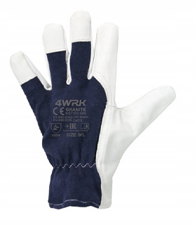 гранітні рукавички виготовлені з високоякісної мʼякої козячої шкіри з зернистою поверхнею, а верхня частина виконана з еластичного бавовняного трикотажу темно-синього кольору.