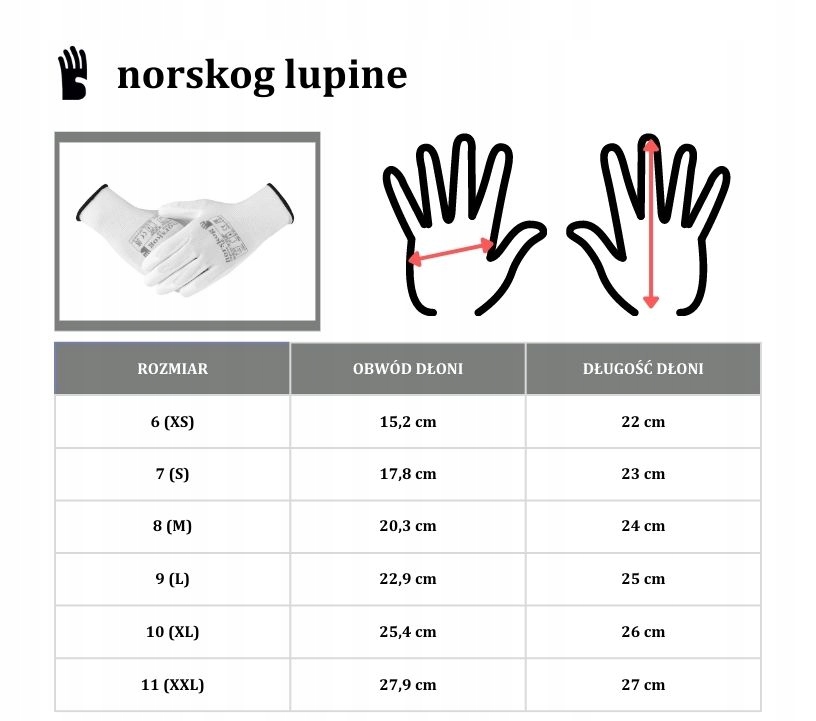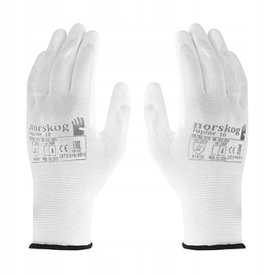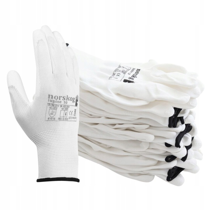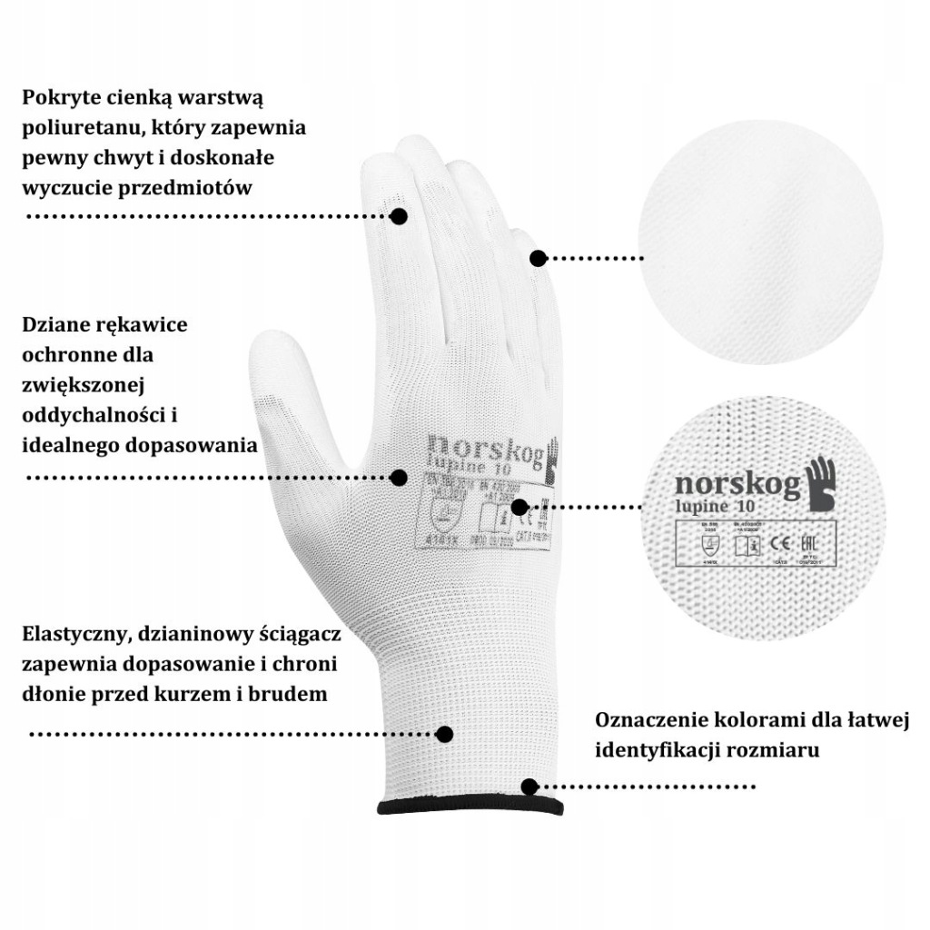 робочі рукавичкиNorskog Lupine мають тонку, ідеально прилягаючу до руки нейлонову устілку білого кольору. Частина захоплення покрита пористим білим поліуретаном, який гарантує хороший захоплення і відчуття утримуваних предметів. Завдяки тому, що тільки долонна частина покрита поліуретаном, руки можуть вільно дихати, що значно підвищує комфорт роботи. Рукавички завершуються еластичними ребрами, які приємні на дотик і ідеально підходять до форми запʼястя, забезпечуючи повний комфорт роботи. Вони бувають розмірів 7-10, що дозволяє добре прилягати до руки, що значно полегшує виконання робіт, що вимагають точності. Крім того, рукавички стійкі до стирання, порізів, розривів і пірсингу, що гарантує їх тривалий термін служби.